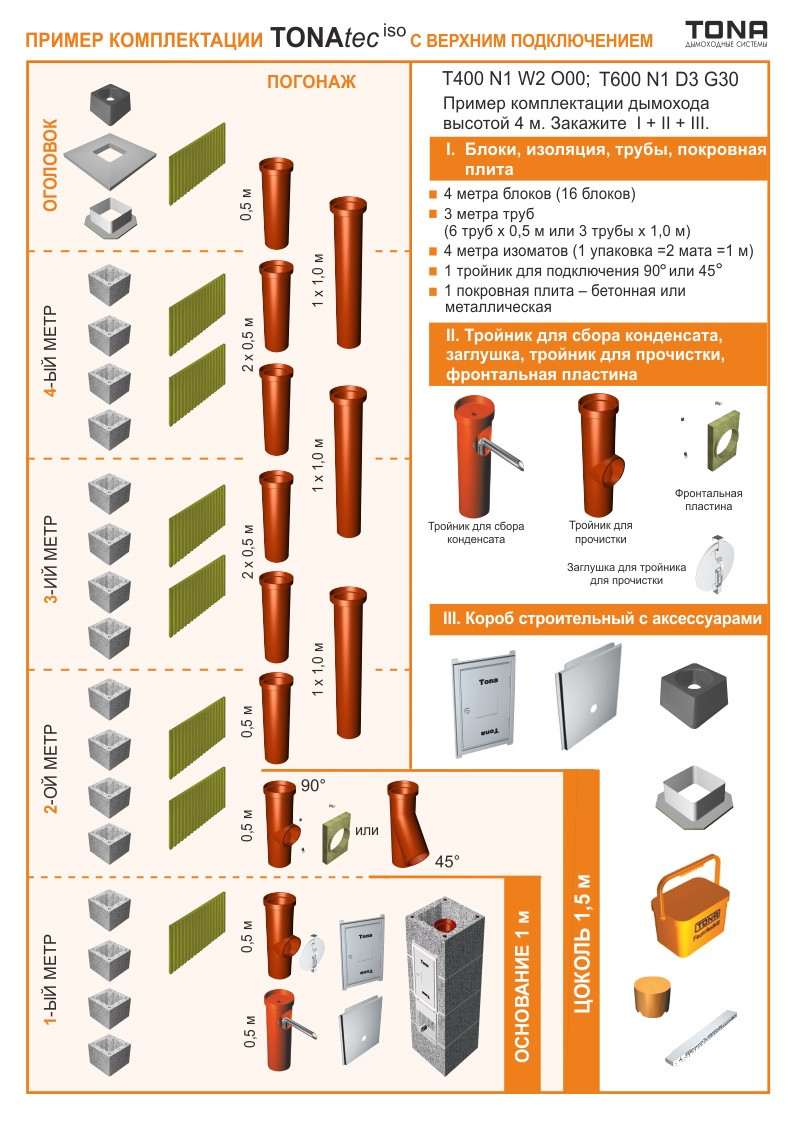 Пример комплектации дымохода TONA tec iso c верхним подключением