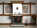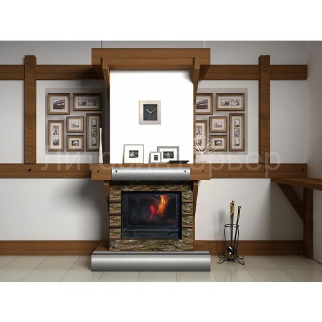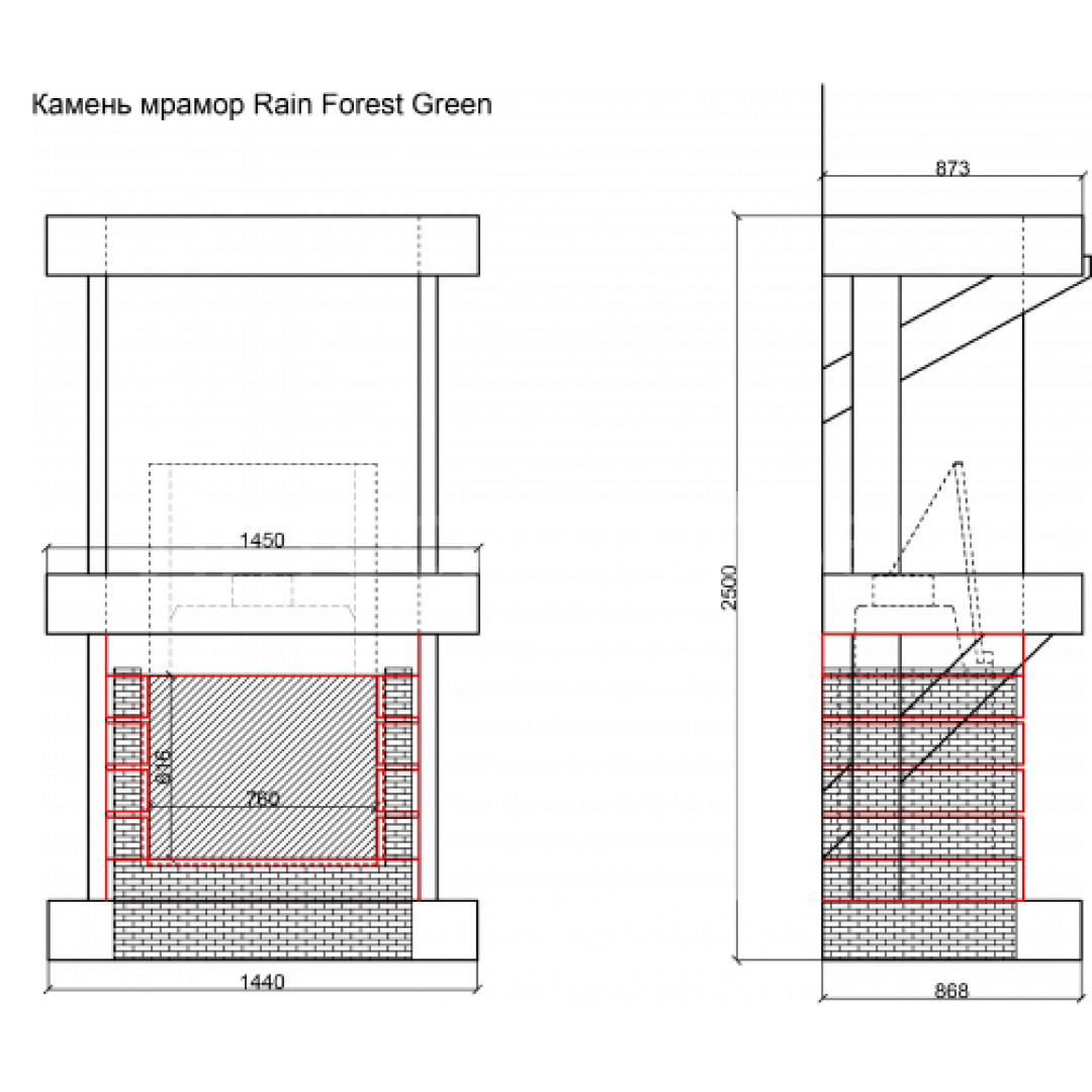 Представлен чертеж-проект камина, а также пример исполнения данного проекта - портал из мрамора Rain Forest Green, декоративных элемнтов из стали, дерева и дровяная топка.