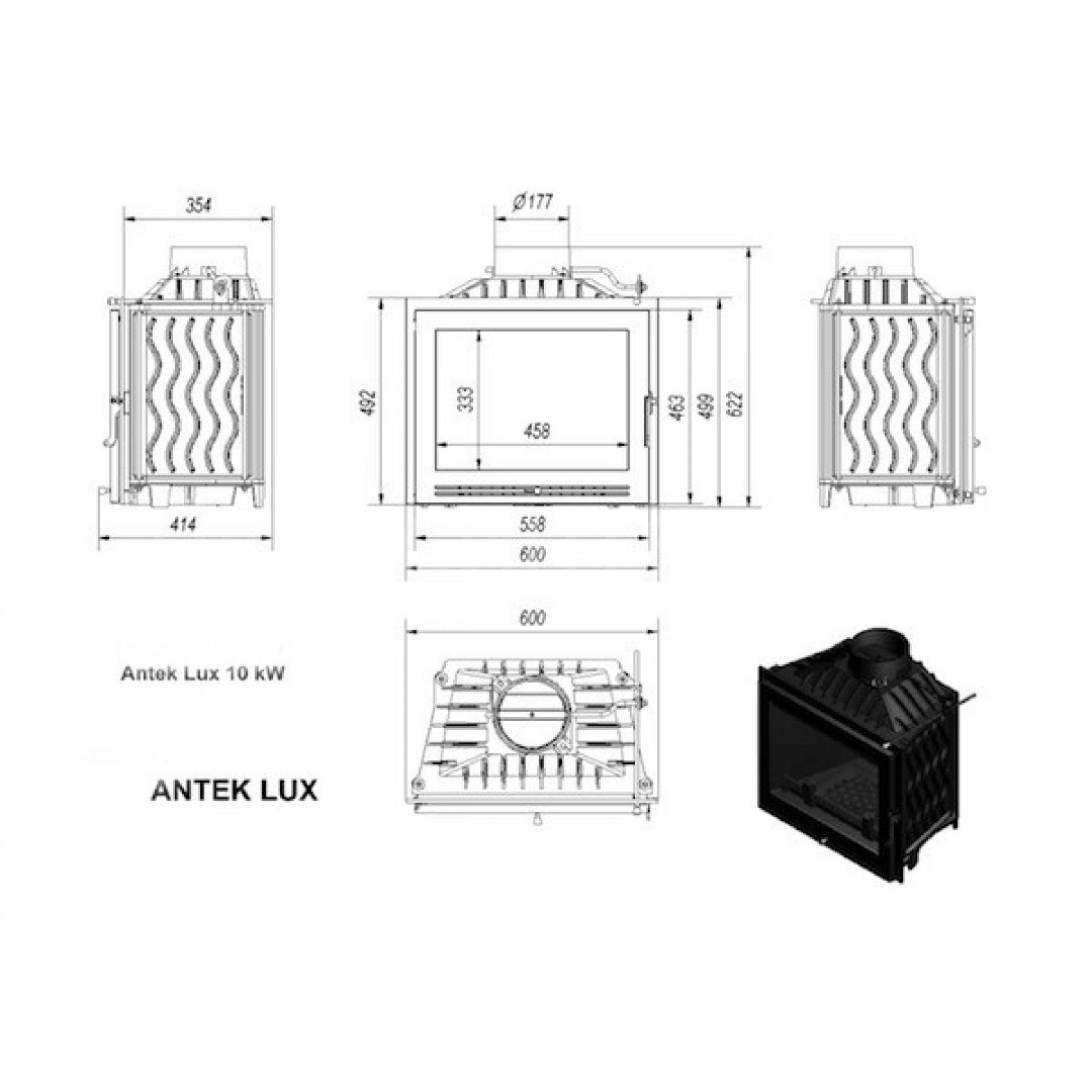 Antek/LUX - высококачественная топка из чугуна, выполненная польской компанией KRATKI. Топка имеет верхнее подключение к дымоходу и оснащена прямым стеклокерамическим стеклом, выдерживающим нагрев до 800 градусов Цельсия.