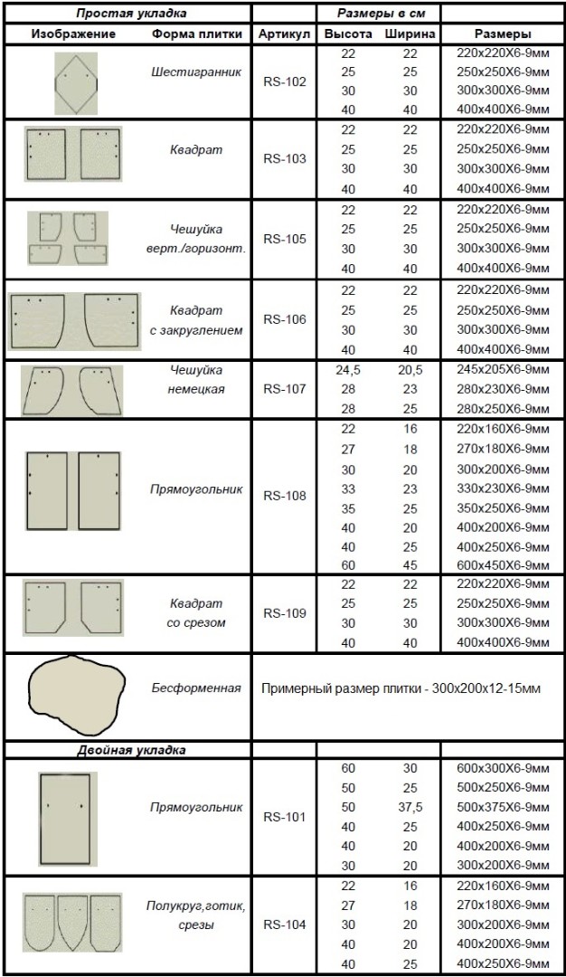Green (зеленая) сланцевая кровля поставляется под заказ. Формы и размеры плитки кровли указаны в приведенной ниже таблице.